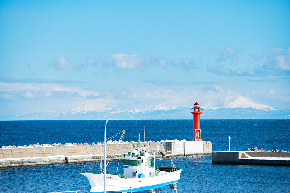 赤灯台をご覧頂きます。この日の知床連山は、雲に覆われ山頂は見えない状態でしたが、